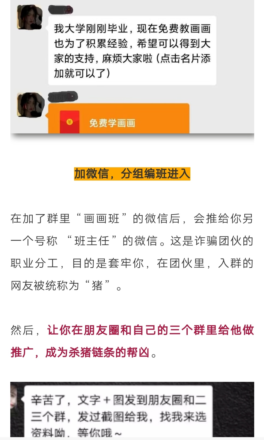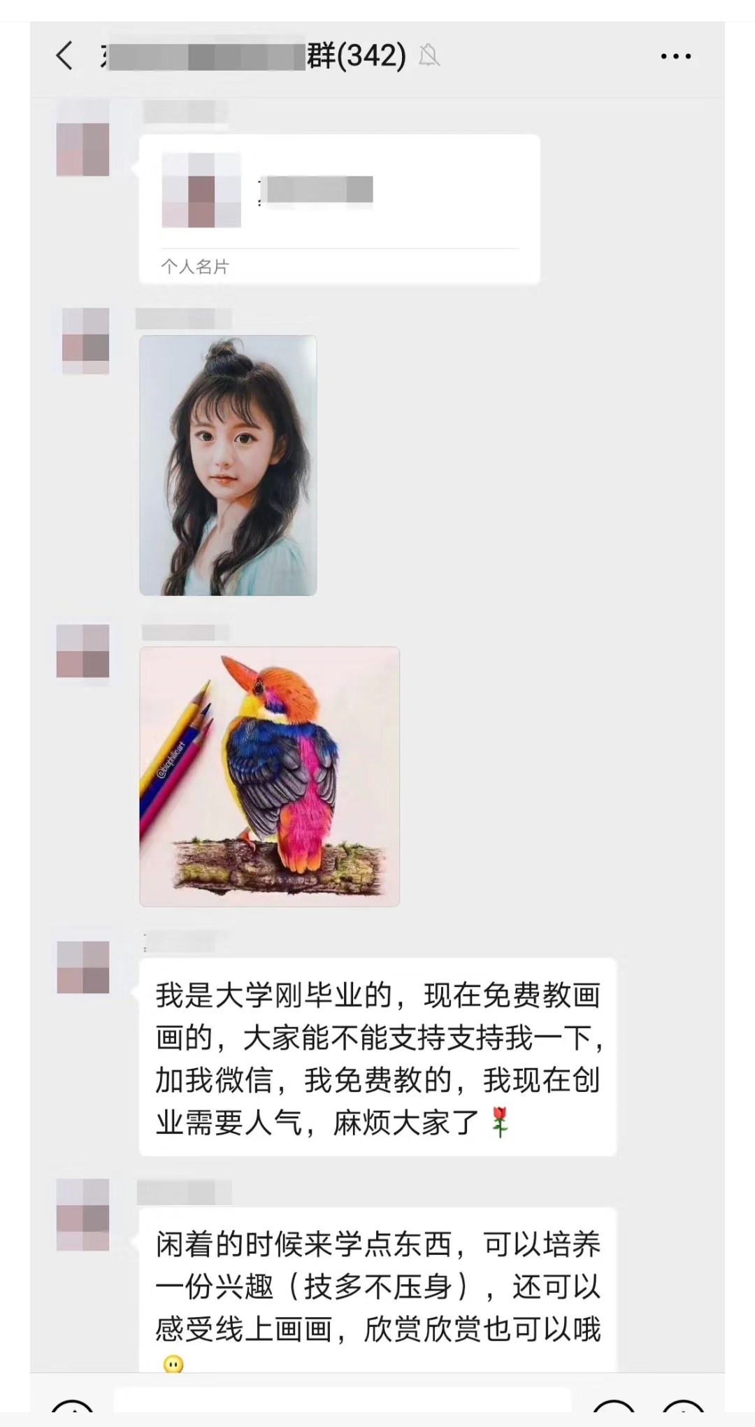 说到骗局套路,最近还发现一个免费教画画的套路,估计很多人都在一些微信群见到过此类信息。