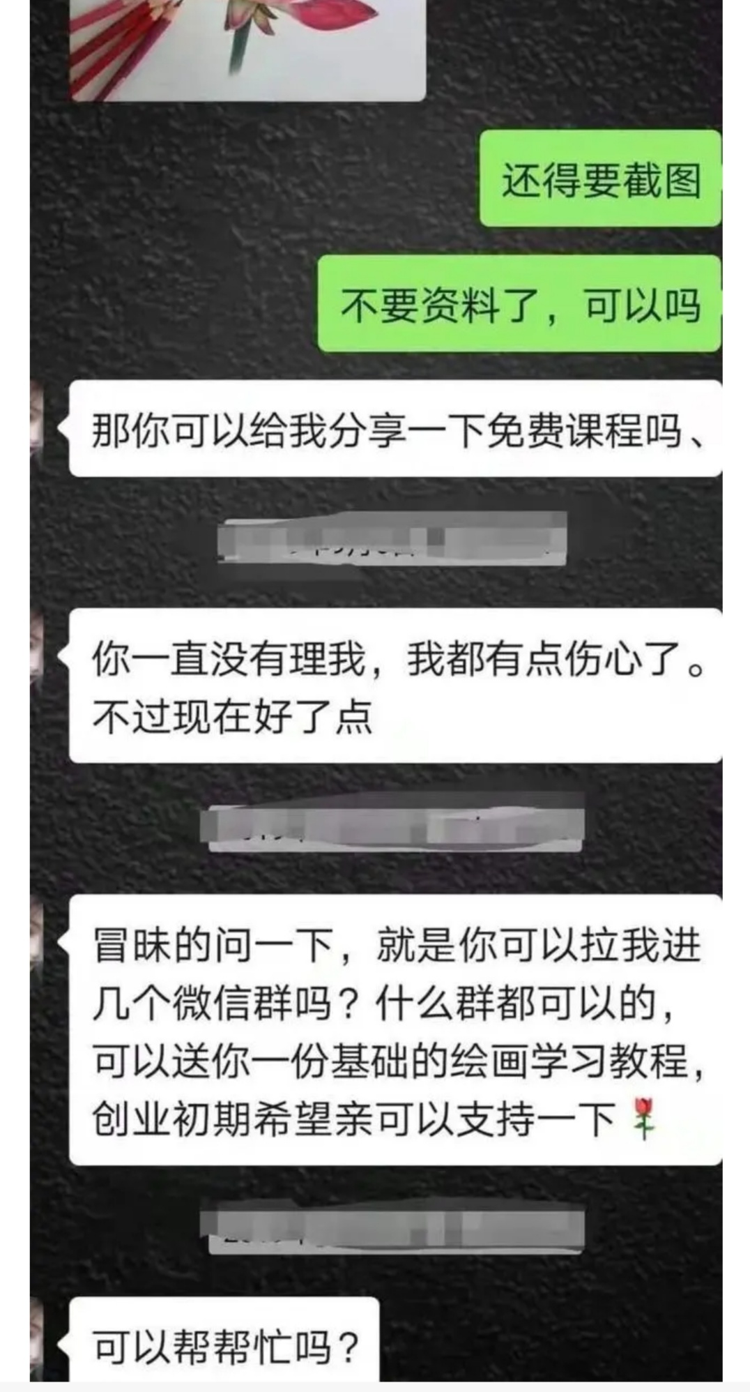 没有提防意识的朋友在微信群里看到这样的消息,大概心里热乎乎的。免费学画画,还能支持一下大学生,一举两得,好事呀!
