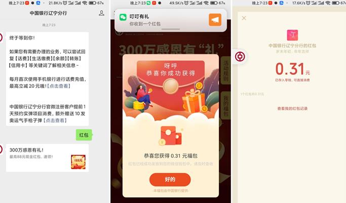 中国银行辽宁分行简单关注回复红包领0.31元首遇礼