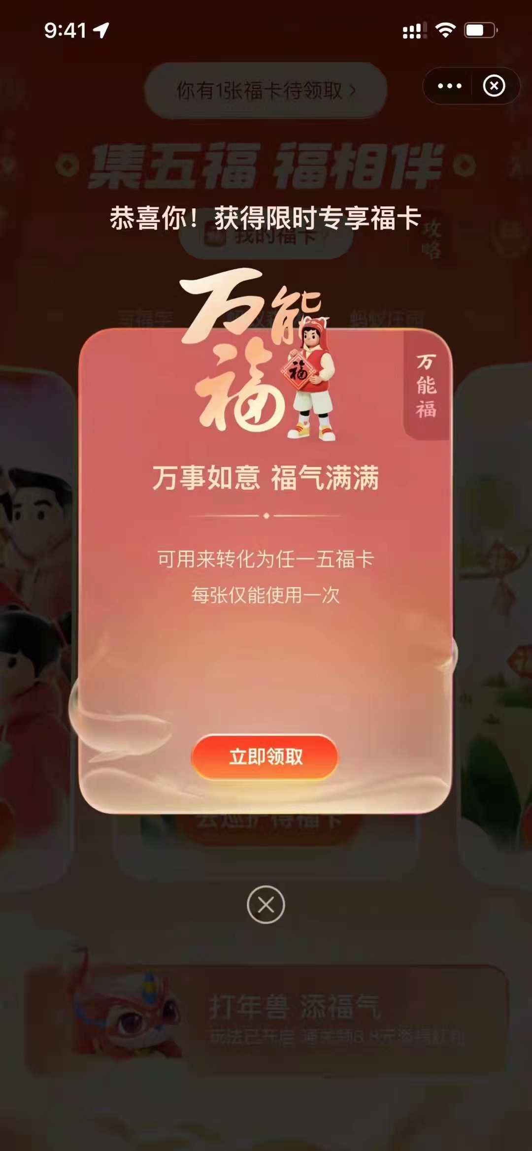 想合成五福后多赚点的话就去打年兽。只有合成后才可以参与打年兽活动,解锁第一个福气值可以获得0.36元添福红包,等除夕开奖的时候一块发放。后面解锁也有几毛钱的红包,最后一个任务解锁会奖励8.8元,不过比较难,除非一开始就合成参与活动,然后每天都把机会用完,包括用副卡兑换的额外机会。而且最好把欢乐场的机会也用完,多得一些福气值。