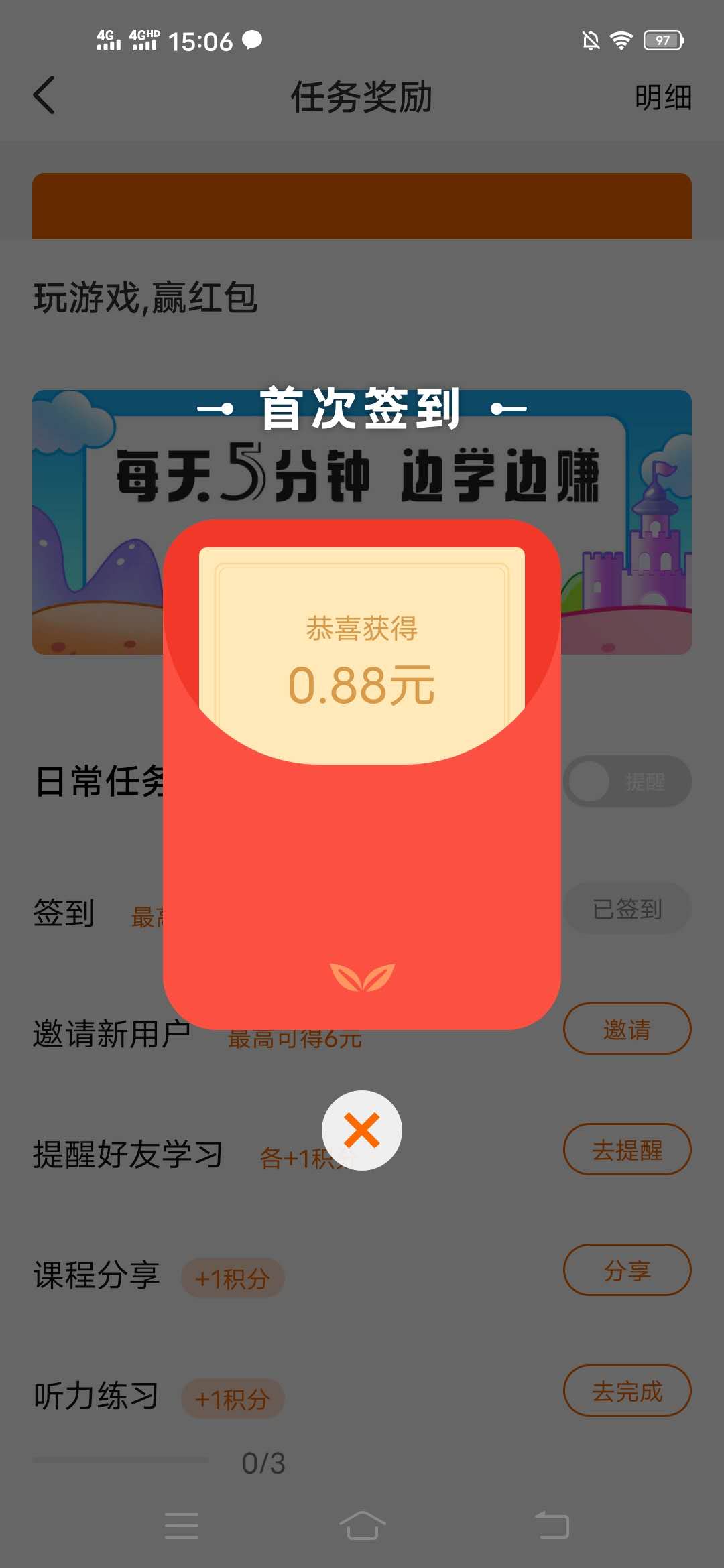 郎果英语APP简单签到薅0.88元微信现金红包